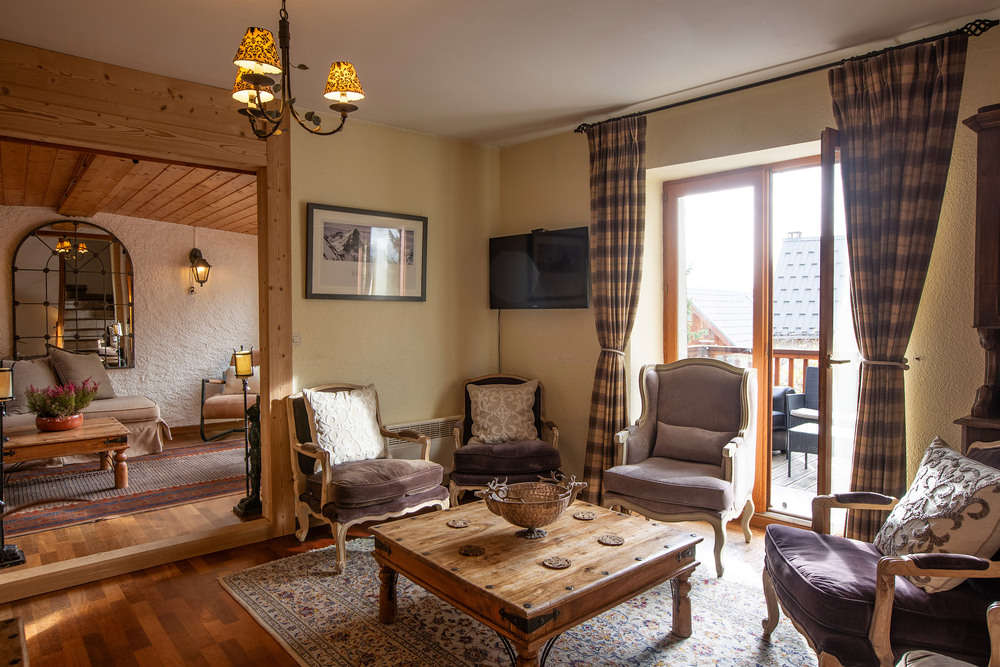 Outdoor space is an important part of the experience. The extended lounge balcony opens onto a terrace with open views across the valley, offering a natural place to pause after a day of French Alps skiing. The setting is calm and residential, yet remains closely connected to the wider Alpe d’Huez ski area, making it well suited to guests seeking a quieter stay within a major ski domain.